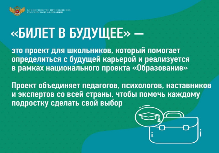 Билет в будущее" – это Всероссийский проект ранней профессиональной ориентации школьников, который реализуется при поддержке государства в рамках национального проекта «Образование». Участие в мероприятии принимают учащиеся 6–11 классов, в том числе с ограниченными возможностями здоровья, родители, педагоги, специалисты, представители среднего профессионального и дополнительного образования.